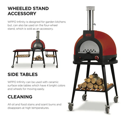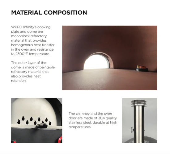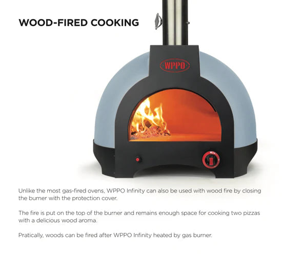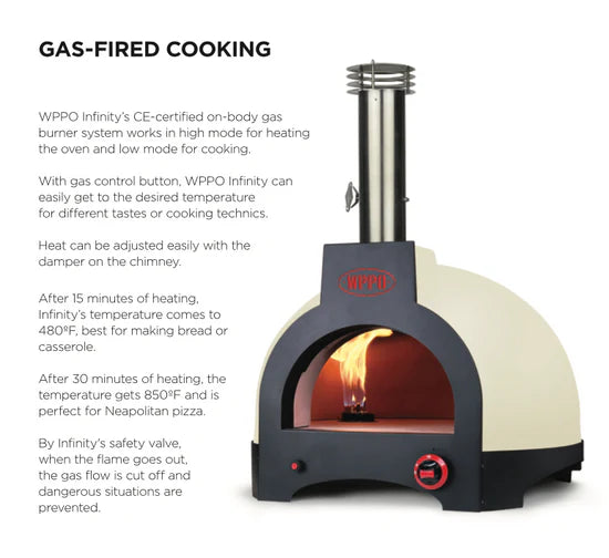 At the heart of the Infinity is a precision designed stone base and dome that radiates heat evenly for beautiful results, no matter what you're making. the certified gas burner heats fast and gives you full control with a chimney damper, while a built in safety valve automatically cuts off the gas if the flam goes out, so you can cook with confidence. If you're going all wood, the monoblock dome locks in that rich, smoky flavor and hits 450°C in about 30 minutes. And when you want the best of both worlds, fire up gas and wood at the same time for a perfect blend of power and taste.